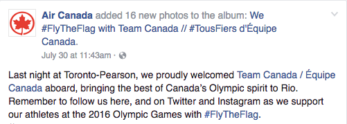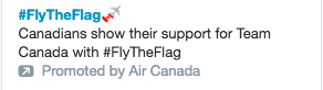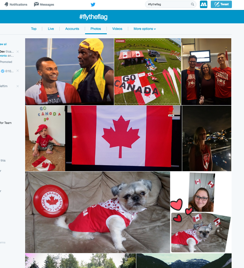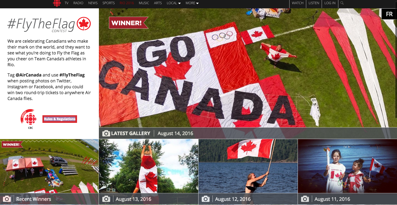 The hashtag #flytheflag is being used on a variety of social channels. Introduced and encouraged by CBC and Air Canada, participants are encouraged to submit compelling content for a chance to win two round-trip tickets to anywhere the airline flies to. See submission rules here.