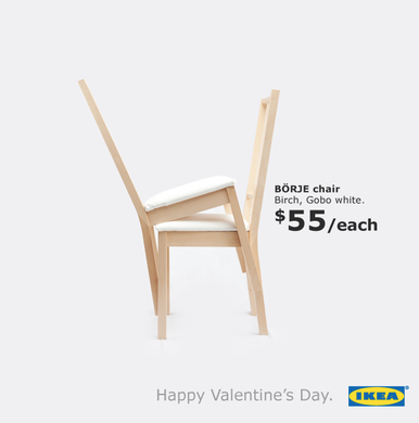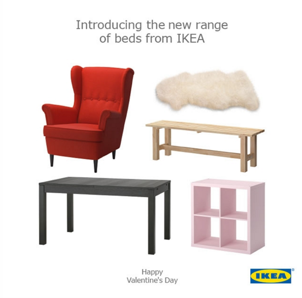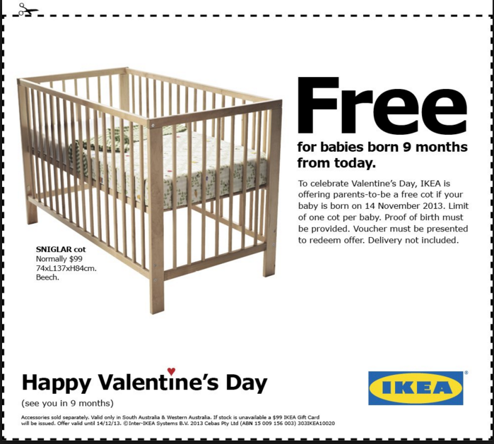 In the past Ikea has offered free cribs (for babies born nine months after Valentine's Day), as well display chairs stacked on top of each other. Last year the ad consisted of new 'beds' (which weren't for sleeping).