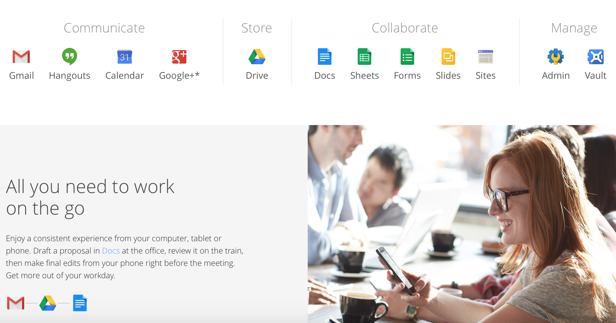 Google Apps for Work operates as a collaboration tool and acts as a virtual office to service all your company needs. Send, share, seek, collaborate, collect and control your documents, and host online conference meetings on the cloud with Google Hangouts, and have all information accessible at all times. You will never have to ‘save’ a document again as its automatic, and the easy share and collaboration features allow you and your colleagues to view, update, comment and collaborate on documents at the same time - online.
