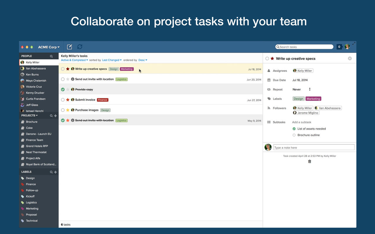Producteev operates as a socially minded task management platform, and allows for organizations to properly prioritize and monitor tasks and activities from initiation to completion online. The simple dashboards, along with the aggregation of information and feedback, which is compiled and organized in relation to individual tasks, allows for an orderly way to inform, collaborate, manage and complete production tasks. Tasks can be flagged with different statuses; active, in progress, paused or complete. and prioritization can range from no priority to very high. Labels can allow for simple tagging to search and find information and @ mentions allow for easy collaboration with teammates.