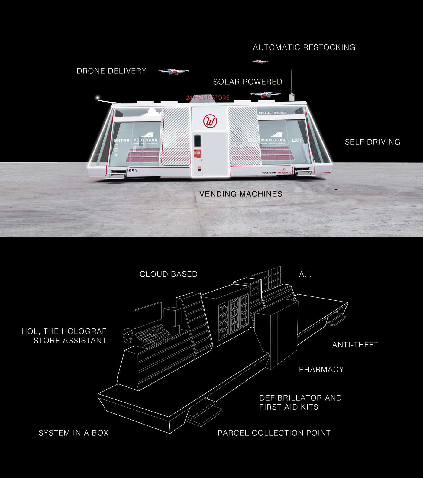 The Moby Mart restocks itself by alerting the warehouse as to what they are low on, and then driving itself to the warehouse to stock up. Currently, the shop is controlled by remote human beings but the plan is to make the navigation autonomous by next year using artificial intelligence.