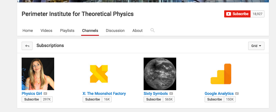 Perimeter Institute's YouTube channel has a massive following that probably consists of students as well as many people who have interest in physics, moon shot projects and Google Analytics. A compilation of videos from leading researchers around the globe exploring concepts from quantum physics to cosmos. The channel also has a lecture series.
