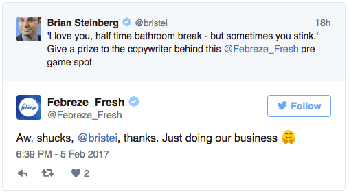 This year was no disappointment. The added field goal for me was from the sheer amount of social media use by big brands to highlight their campaigns/commercials and interact with their consumers on social as they react to the brilliance (or sloppiness) of their ads.