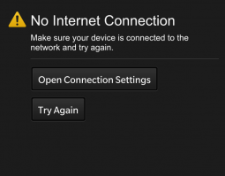 We get a nice warning screen for free when we don’t have a connection. It even gives us a button that takes us straight to our settings. From the settings screen we get a button that takes us back to the warning screen, where we can try again.